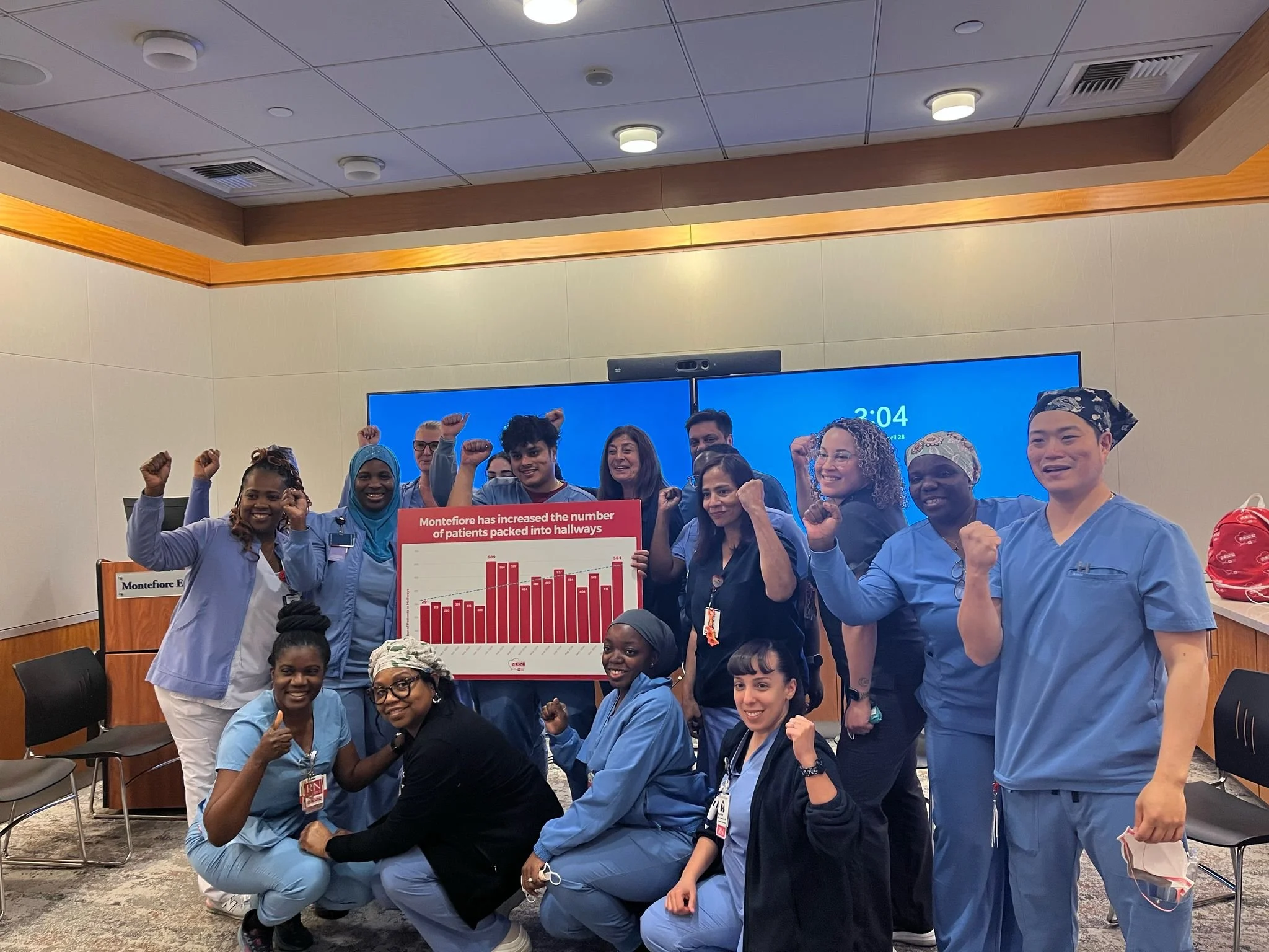 This Monday, almost 100 NYSNA nurses showed up to a class action grievance filed against Montefiore for refusing to eliminate hallway beds and address ED overcrowding 💪🙌. Many nurses from across Monte Bronx spoke out about the horrors of overcrowding and made it very clear that no human being should ever be put in a hallway🙌🙌! This grievance was a powerful moment of nurses coming together to fight for more beds, more space, dignity and safety for ALL patients 🔥🙌